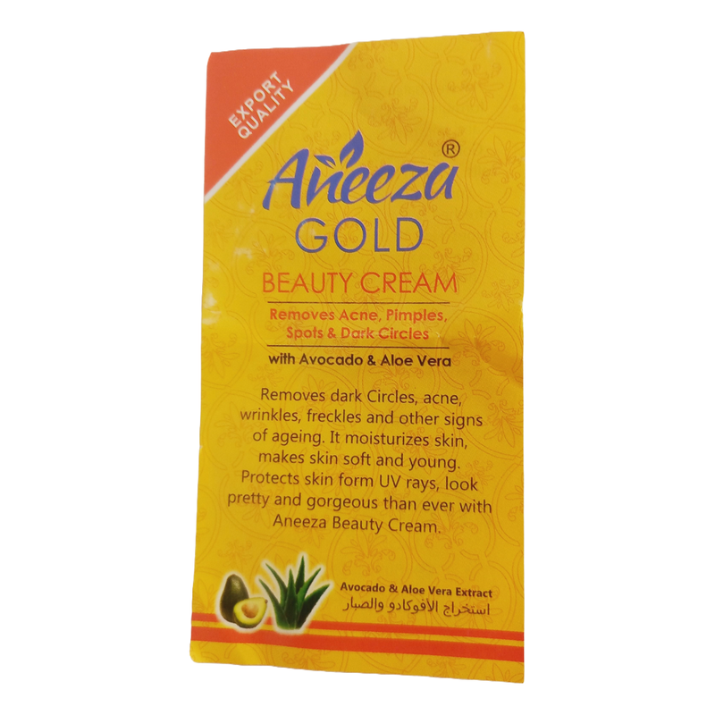 A well balanced de-pigmentation formula which helps lighten the skin and improves its condition. Aneeza Gold Beauty Cream with avocado and aloe vera integration for eliminates dead cells, melanin deposits and improves your complexion. It leaves skin feeling refreshed and soft. Its removes acne, pimples, spots, wrinkles, freckles, dark circles and other signs of ageing. It moisturizes skin, makes skin soft and young. It also protects skin from UV rays, with look pretty and gorgeous then ever. It is suitable for all skin types. How to use: Apply liberally and gently massage onto your face and neck. Avoid getting into your eyes.