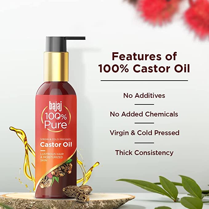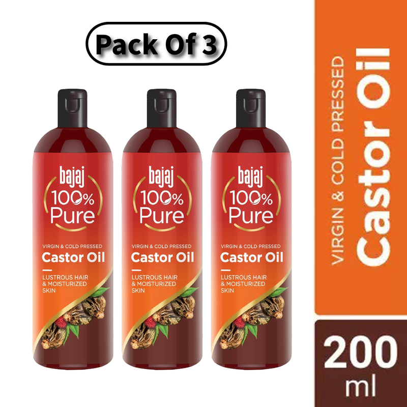 Bajaj 100% Pure Virgin & Cold Pressed Castor Oil Lustrous Hair & Moisturized Skin: Net Weight - 200ml, Bajaj 100% Pure Castor Oil is great for Skin and Hair. It is Virgin and cold pressed oil. Bajaj 100% pure Castor oil has no additives or chemicals added during processing. Regular application results in Lustrous Shiny Hair & Soft Skin. Bajaj Castor Oil is 100% Pure with No Silicones, Cruelty free, Paraben free and Lead free. It is a 100% vegetarian product. Free from additives, this oil is suitable for all skin & hair types.